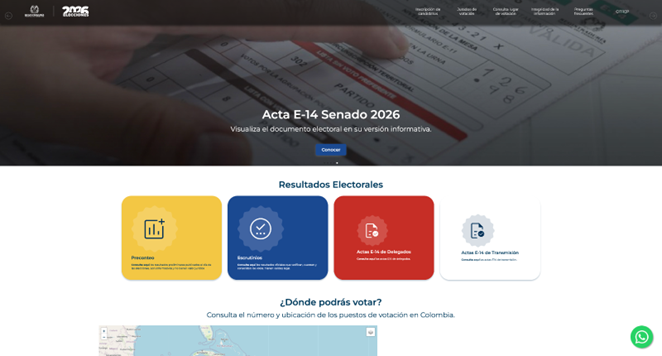 La Registraduría Nacional reiteró que su portal institucional es el único sitio oficial habilitado para la consulta y descarga de las actas E-14 correspondientes a las elecciones legislativas y las consultas presidenciales de 2026, por lo que recomendó a la ciudadanía acudir únicamente a esta plataforma para acceder a los documentos del proceso electoral.
