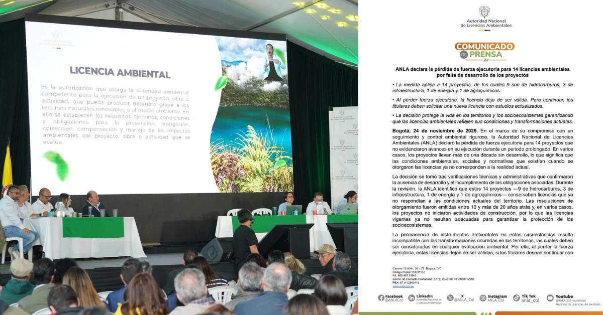 La Autoridad Nacional de Licencias Ambientales (ANLA) declaró la pérdida de fuerza ejecutoria para 14 licencias ambientales que no presentaron avances en su ejecución. Durante las verificaciones técnicas y administrativas, la entidad confirmó la ausencia de desarrollo y el incumplimiento de obligaciones, situación que dejó sin vigencia instrumentos que no reflejan la realidad territorial.
