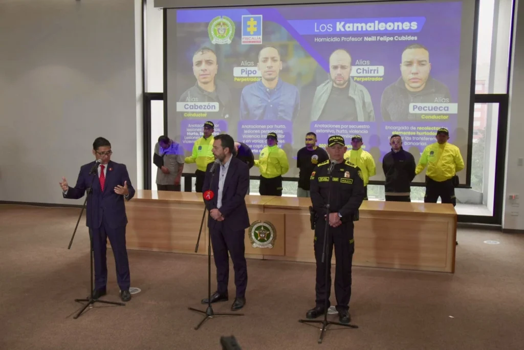 Tras dos meses de investigación, el análisis de más de 200 horas de video y la revisión de al menos 120 cámaras de seguridad, las autoridades lograron la captura de los presuntos responsables del homicidio del profesor Neill Felipe Cubides. Se trata de una estructura delincuencial conocida como “Los Kamaleones”, señalada de operar bajo la modalidad de “paseo millonario” en Bogotá.