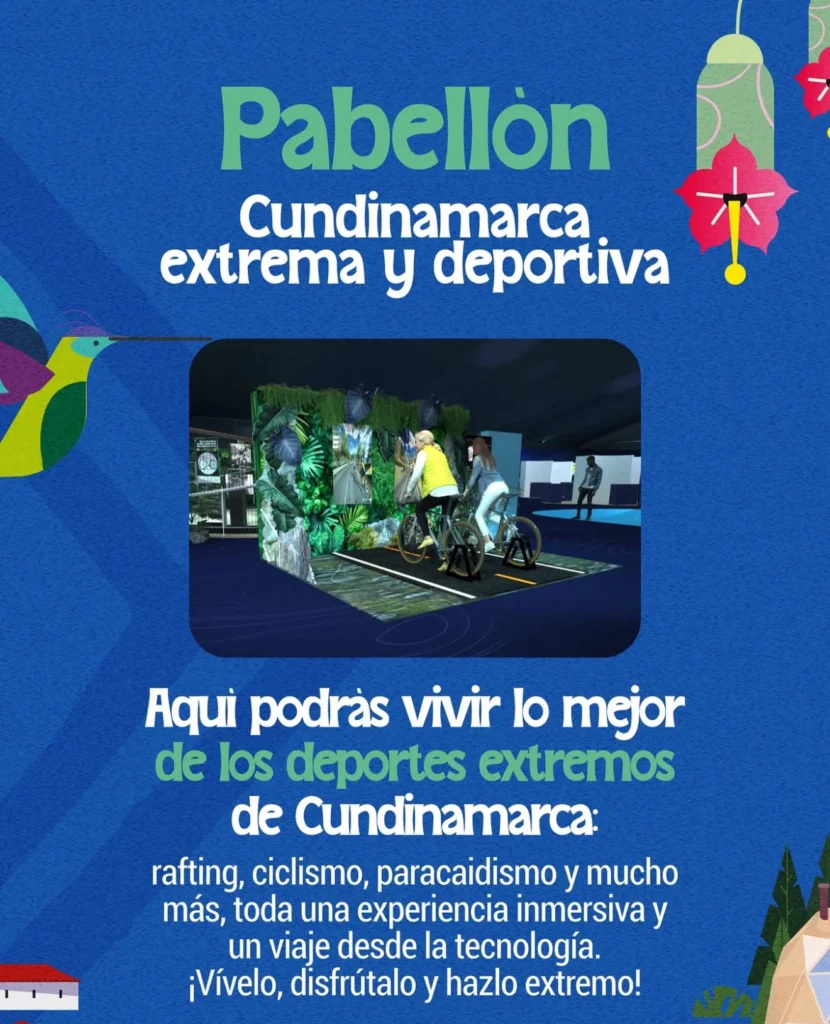 El pabellón “Cundinamarca extrema y deportiva” se consolida como uno de los principales atractivos del festival. Aquí podrás vivir lo mejor de los deportes extremos de Cundinamarca: rafting, ciclismo, paracaidismo y mucho más, toda una experiencia inmersiva y un viaje desde la tecnología.
