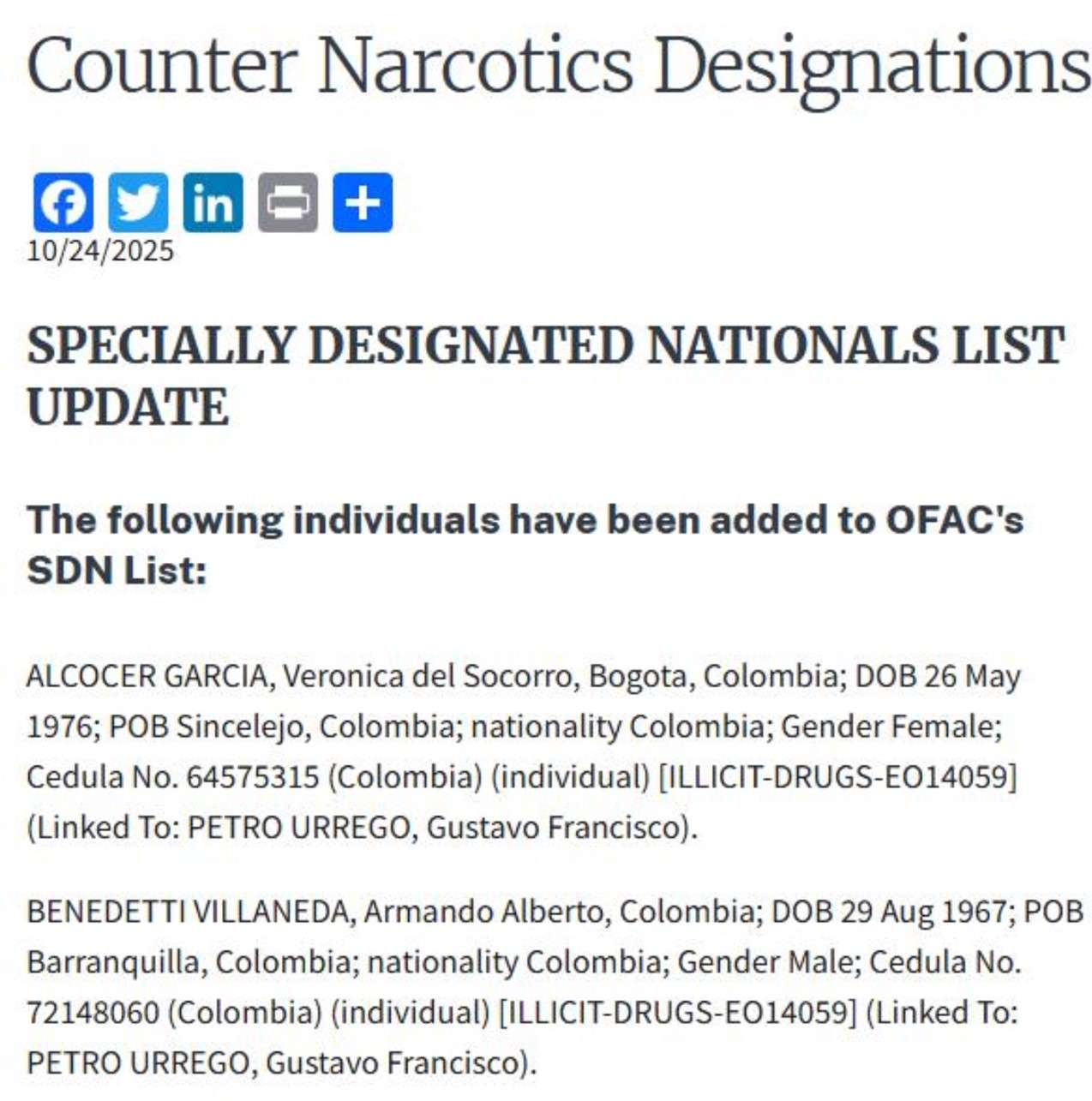 El Gobierno de Estados Unidos incluyó este 24 de octubre de 2025 al presidente Gustavo Petro en la llamada Lista Clinton, una medida que también cobija a la primera dama Verónica Alcocer, su hijo Nicolás Petro y al ministro del Interior, Armando Benedetti. La decisión, impulsada por el senador colombiano-estadounidense Bernie Moreno, ha generado tensiones diplomáticas y preocupación internacional.