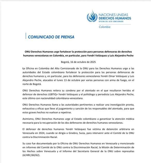 A través de un comunicado, la Oficina del Alto Comisionado de las Naciones Unidas para los Derechos Humanos (ONU) hizo un llamado al Estado colombiano para fortalecer la protección de las personas defensoras de derechos humanos venezolanas que residen en el país. La solicitud se dio luego del atentado ocurrido el 13 de octubre en el norte de Bogotá, en el que resultaron heridos los activistas Yendri Velásquez y Luis Alejandro Peche.