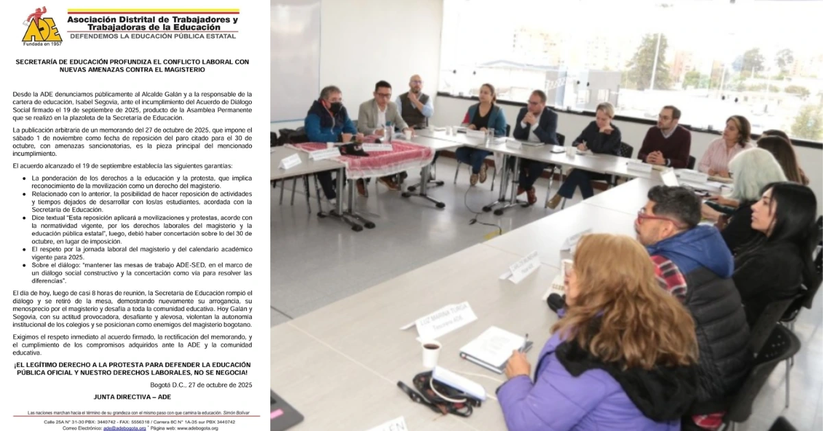 La Asociación Distrital de Educadores (ADE) denunció públicamente al alcalde Galán y a la secretaria de Educación, Isabel Segovia, por incumplir el Acuerdo de Diálogo Social firmado el 19 de septiembre de 2025, tras la Asamblea Permanente con la Secretaría de Educación.