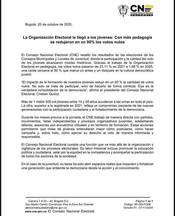 El Consejo Nacional Electoral (CNE) celebró los resultados de las elecciones de los Consejos Municipales y Locales de Juventud, donde la participación y la calidad del voto juvenil alcanzaron cifras históricas. Gracias a un trabajo constante de pedagogía electoral, los votos nulos pasaron del 23,11 % en 2021 al 1,98 % en 2025, una reducción cercana al 90 %.